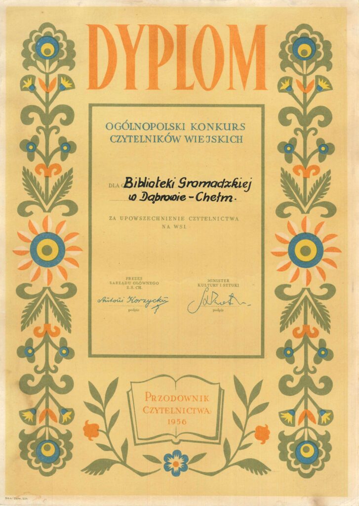 Dyplom dla Biblioteki Gromadzkie w Dąbrowie Chełmińskiej za upowszechnianie czytelnictwa na wsi