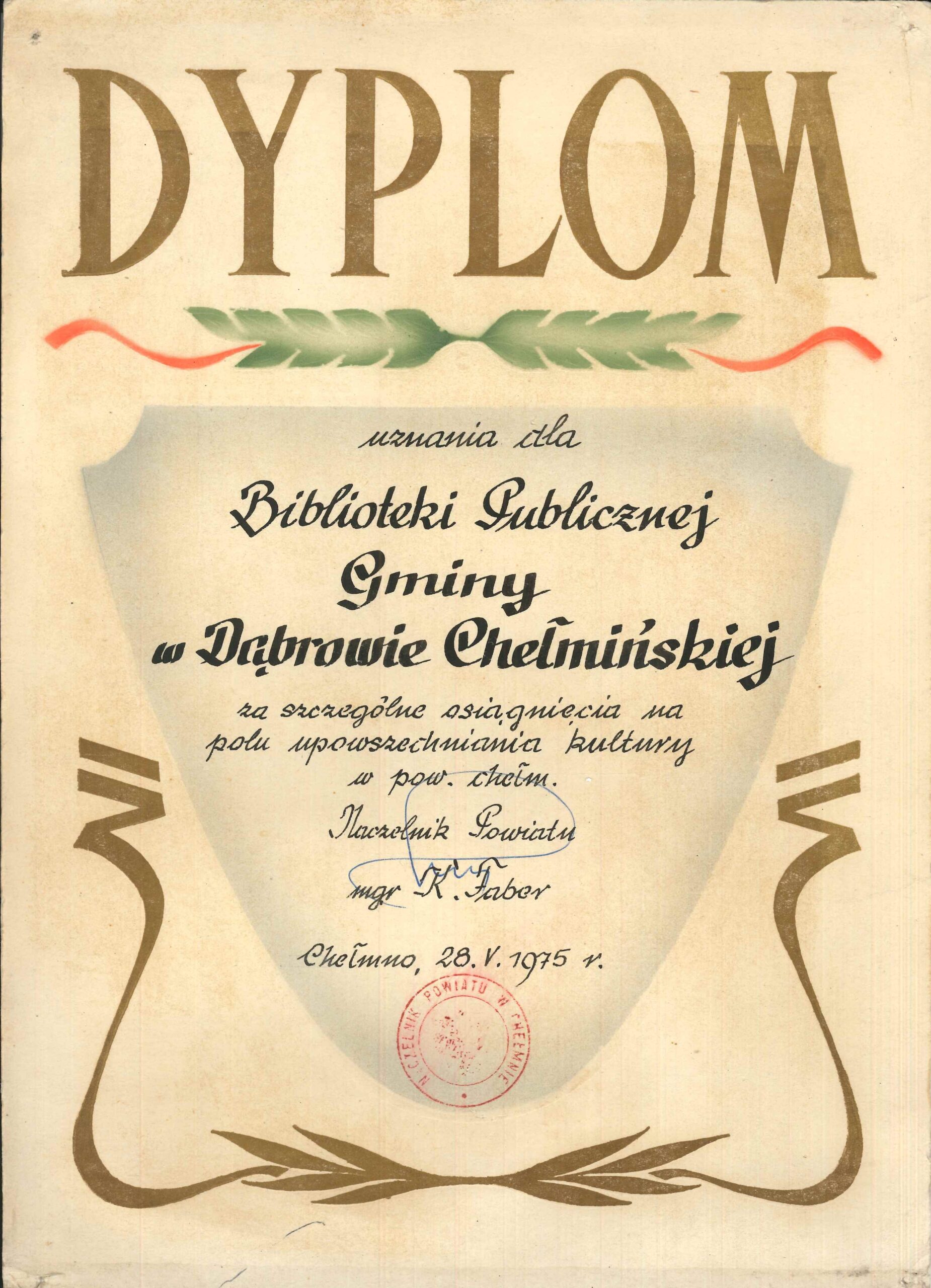 Dyplom uznania dla Biblioteki Publicznej w Dąbrowie Chełmińskiej za szczególne osiągnięcia na polu